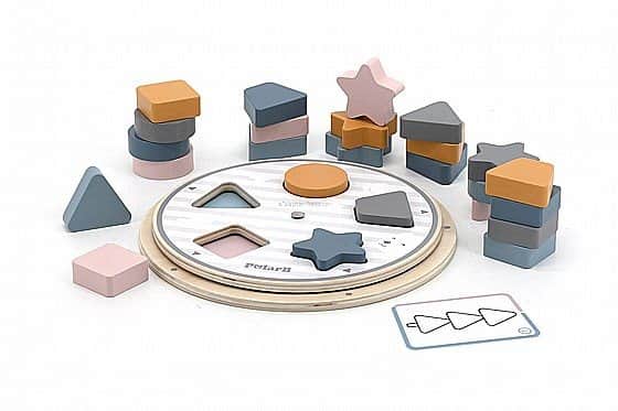 המשחק מכיל: גלגל צורות מסתובב, צורות, כרטיסי דגם ותיק אחסון.